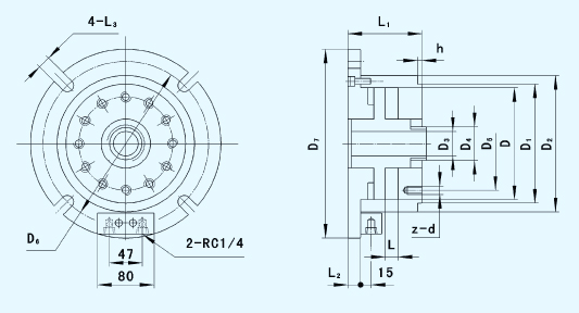 注:可根據(jù)用戶要求,設(shè)計與K51、K54等系列動力卡盤配套的立式固定油缸。Note:According to the users demand to design vertical stationary hydraulic cylinders matching with K51、K54 etc series power chucks.