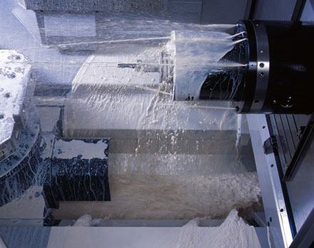 高速加工的高生產率所帶來的切屑量是驚人的。為了確保切屑可靠去除,加工室里的擋板幾乎呈垂直的構造,切屑與主軸頭部和頂部噴出的冷卻液一起流入工作臺正下方寬敞的中心切屑槽內,將與冷卻液一起被沖刷到機身外部。附帶過濾功能的提升排屑器,能確保始終供應清潔的冷卻液。 通過主軸頭部8個噴嘴冷卻液系統(tǒng),頂部噴淋冷卻液系統(tǒng),中心切屑槽和床身冷卻系統(tǒng)及提升排屑器這些標準配置,提高了連續(xù)加工的穩(wěn)定性及表面質量。